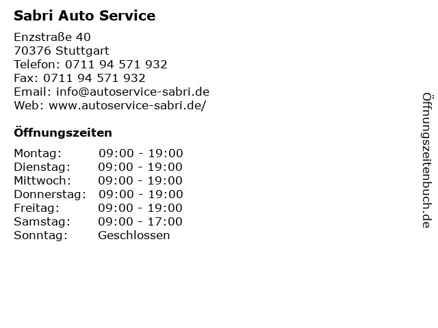 | Öffnungszeiten Sabri Auto Service in Stuttgart anzeigen | |