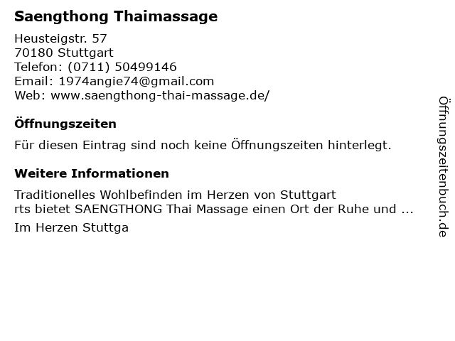 | Öffnungszeiten Saengthong Thaimassage in Stuttgart anzeigen | |