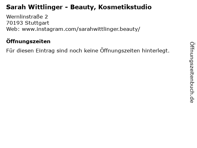 | Öffnungszeiten Sarah Wittlinger - Beauty, Kosmetikstudio in Stuttgart anzeigen | |