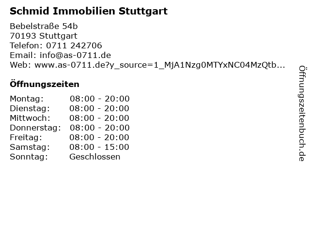 | Öffnungszeiten Schmid Immobilien Stuttgart in Stuttgart anzeigen | |