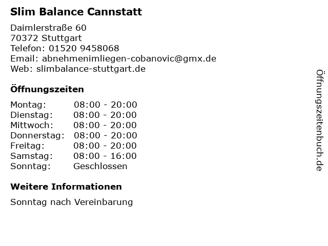 | Öffnungszeiten Slim Balance Cannstatt in Stuttgart anzeigen | |