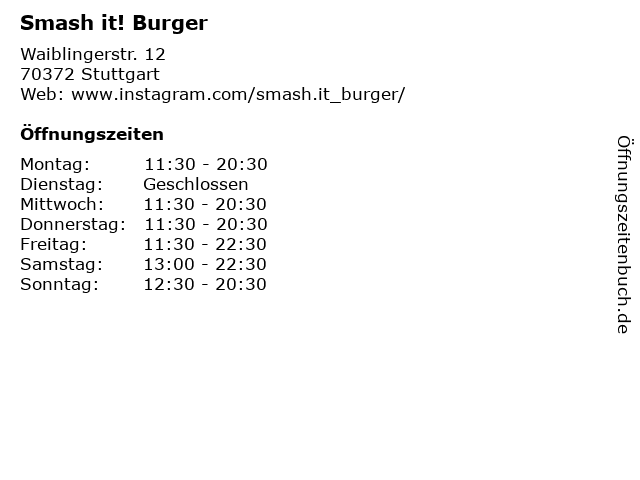 | Öffnungszeiten Smash it! Burger in Stuttgart anzeigen | |