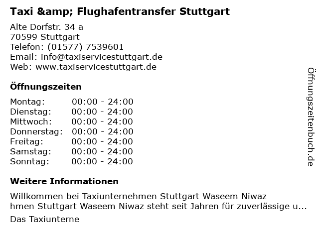 1 ABC-Kurier Sonderfahrten und Flughafentransfer (Entfernung: 1,25 km) Im Chausseefeld 9, 70599 Stuttgart 3 ATRIA Parking GmbH - Parken Flughafen Stuttgart (Entfernung: 1,11 km) Zeppelinstraße 29, 73760 Ostfildern 6 Osteopathie Bilharz - Osteopathie Stuttgart (Entfernung: 2,63 km) Kirchheimer Straße 69, 70619 Stuttgart |