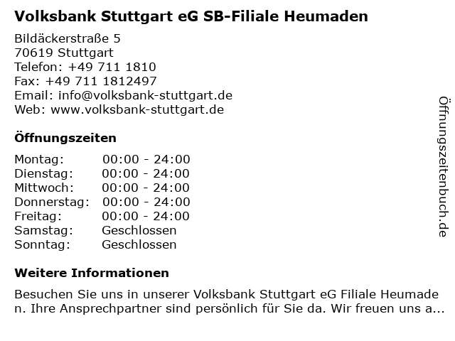 2 Baden-Württembergische Bank (SB-ServiceCenter) (Entfernung: 0,05 km) Bockelstraße 23, 70619 Stuttgart 4 Volksbank am Württemberg eG, Filiale Heumaden (Beratung nach Terminvereinbarung) (Entfernung: 0,06 km) Fenchelstraße 13, 70619 Stuttgart 6 Sparda Bank Baden-Württemberg - (SB-Center) (Entfernung: 1,67 km) Kirchheimer Straße 34, 70619 Stuttgart |