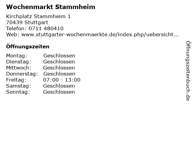 | Öffnungszeiten Wochenmarkt Stammheim in Stuttgart anzeigen | |