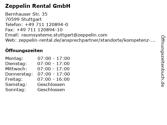 | Öffnungszeiten Zeppelin Rental GmbH in Stuttgart anzeigen | |