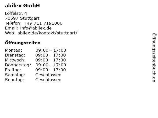 | Öffnungszeiten abilex GmbH in Stuttgart anzeigen | |