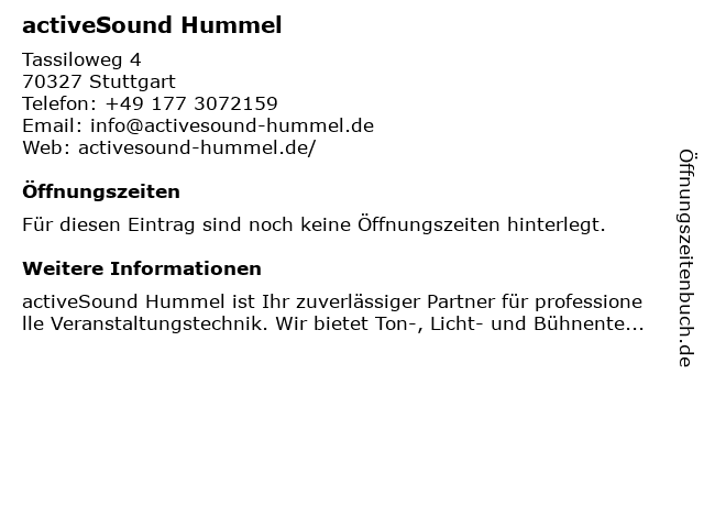 | Öffnungszeiten activeSound Hummel in Stuttgart anzeigen | |