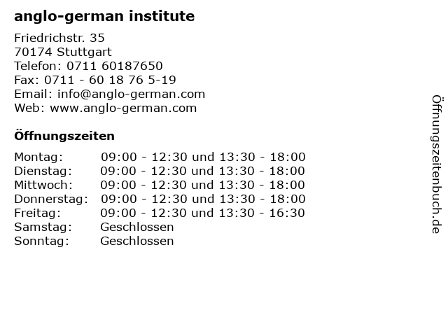 | Öffnungszeiten anglo-german institute in Stuttgart anzeigen | |