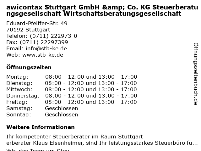 1 Boorberg GmbH Wirtschaftsprüfungs- und Steuerberatungsgesellschaft (Entfernung: 1,07 km) Königstr. 1 A, 70173 Stuttgart 2 Gramp Horst Dr. GmbH Wirtschaftsprüfungsgesellschaft Steuerberatungsgesellschaft (Entfernung: 1,64 km) Silberburgstr. 147, 70176 Stuttgart 3 Kruse & Partner Steuerberatungsgesellschaft mbH (Entfernung: 1,71 km) Rotebühlstraße 44, 70178 Stuttgart 6 |