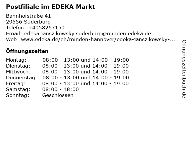 | Öffnungszeiten Postfiliale im EDEKA Markt in Suderburg anzeigen | |