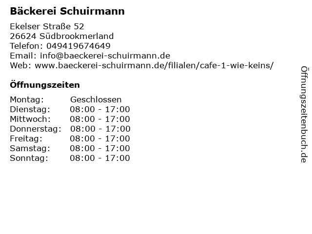 | Öffnungszeiten Bäckerei Schuirmann in Südbrookmerland anzeigen | |