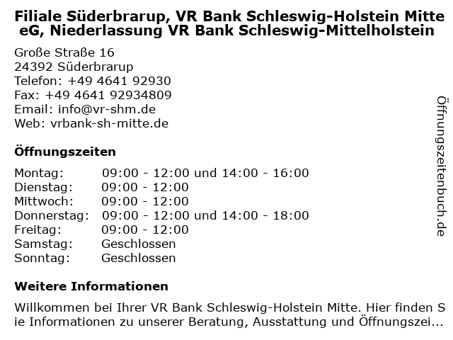 Branchen & Suchbegriffe zu Filiale Süderbrarup, VR Bank Schleswig-Holstein Mitte eG, Niederlassung VR Bank Schleswig-Mittelholstein:bank, eg, holstein, mitte, mittelholstein, niederlassung, süderbrarup, vr |