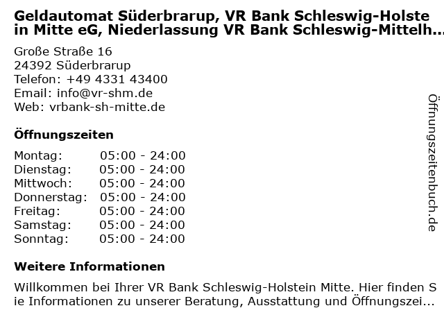 1 Filiale Süderbrarup, VR Bank Schleswig-Holstein Mitte eG, Niederlassung VR Bank Schleswig-Mittelholstein (Entfernung: 0,00 km) Große Straße 16, 24392 Süderbrarup 3 VR Bank Flensburg-Schleswig eG (Geldautomat) (Entfernung: 0,99 km) Schleswiger Straße 64, 24392 Süderbrarup 4 6 |