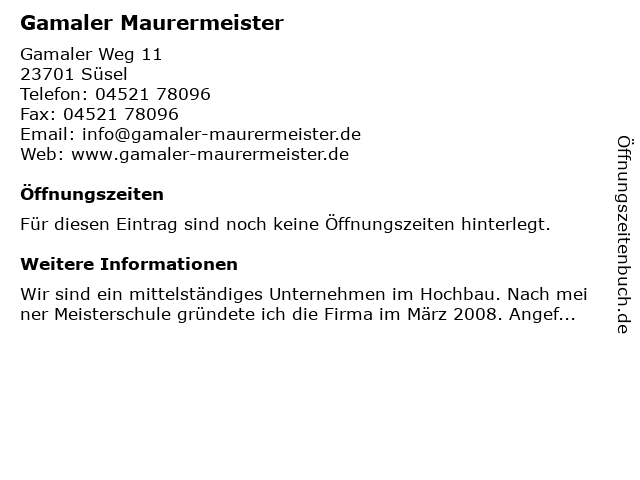 | Öffnungszeiten Gamaler Maurermeister in Süsel anzeigen | |