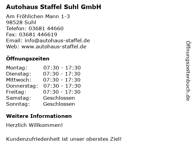 | Öffnungszeiten Autohaus Staffel Suhl GmbH in Suhl anzeigen | |