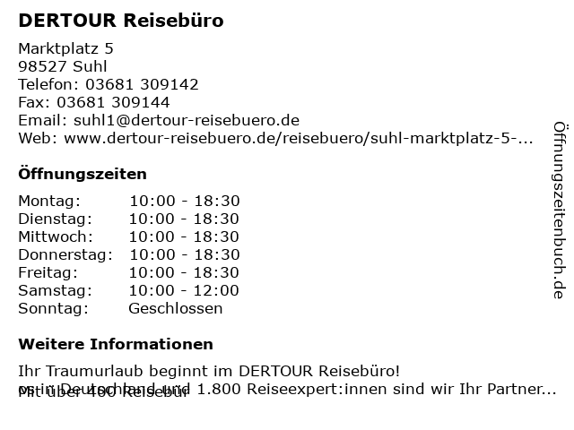 | Öffnungszeiten DERTOUR Reisebüro in Suhl anzeigen | |