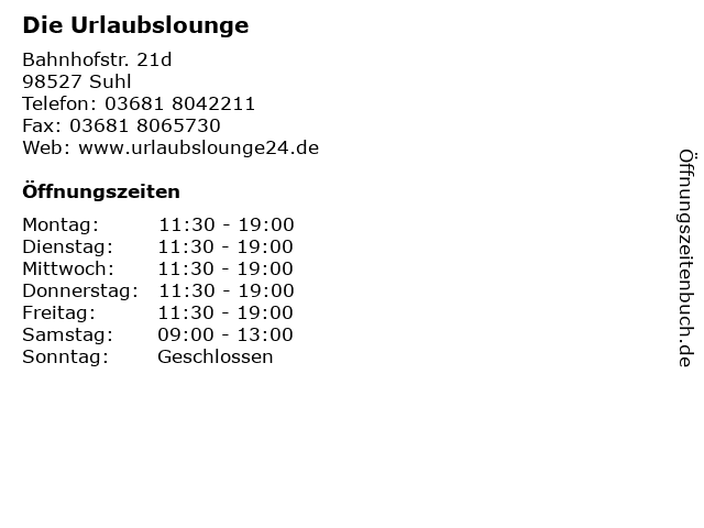 | Öffnungszeiten Die Urlaubslounge in Suhl anzeigen | |