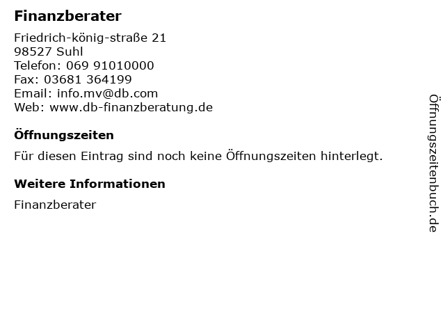 | Öffnungszeiten Finanzberater in Suhl anzeigen | |