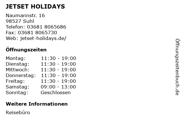 | Öffnungszeiten JETSET HOLIDAYS in Suhl anzeigen | |