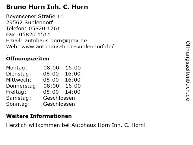 | Öffnungszeiten Bruno Horn Inh. C. Horn in Suhlendorf anzeigen | |