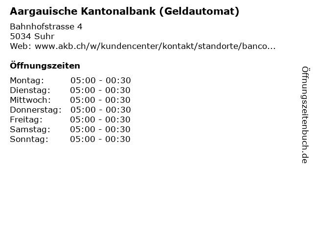 | Öffnungszeiten Aargauische Kantonalbank (Geldautomat) in Suhr anzeigen | |