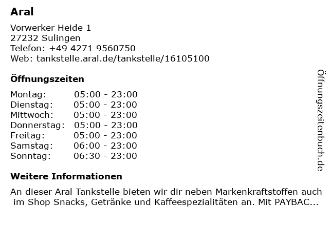 | Öffnungszeiten Aral in Sulingen anzeigen | |