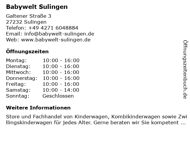 | Öffnungszeiten Babywelt Sulingen in Sulingen anzeigen | |