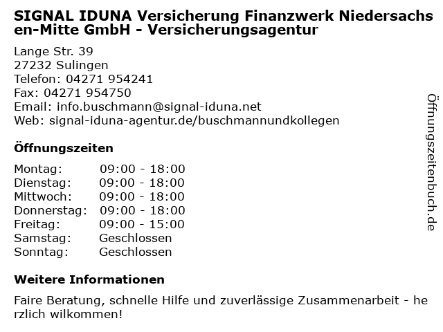 Branchen & Suchbegriffe zu SIGNAL IDUNA Versicherung Finanzwerk Niedersachsen-Mitte GmbH - Versicherungsagentur:finanzwerk, iduna, mitte, niedersachsen, signal, versicherung, versicherungsagentur |