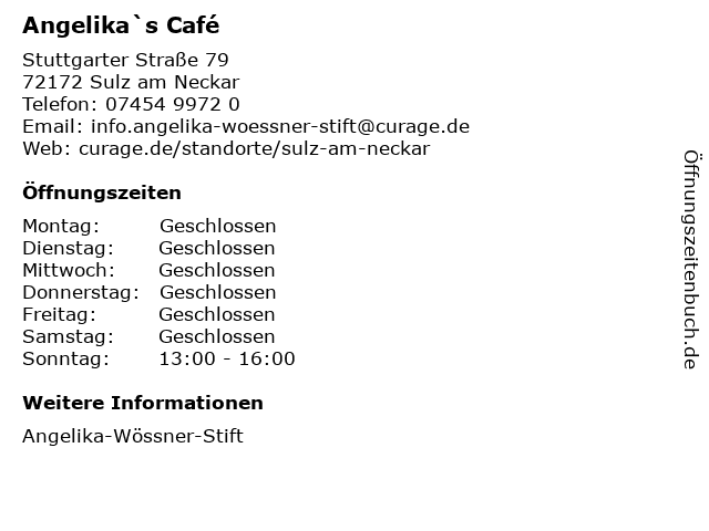 | Öffnungszeiten Angelika`s Café in Sulz am Neckar anzeigen | |