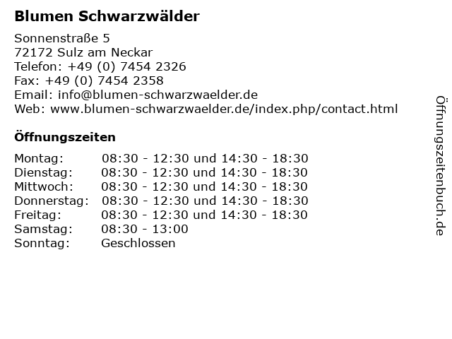 | Öffnungszeiten Blumen Schwarzwälder in Sulz am Neckar anzeigen | |