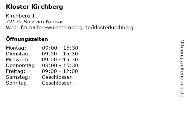 | Öffnungszeiten Kloster Kirchberg in Sulz am Neckar anzeigen | |