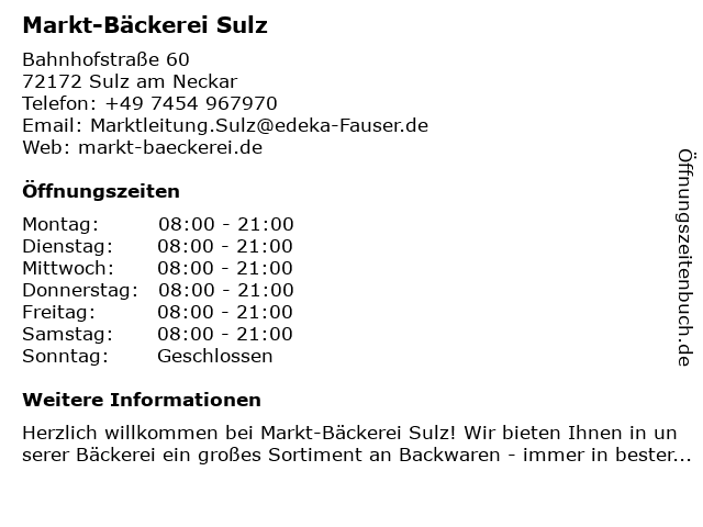 | Öffnungszeiten Markt-Bäckerei Sulz in Sulz am Neckar anzeigen | |
