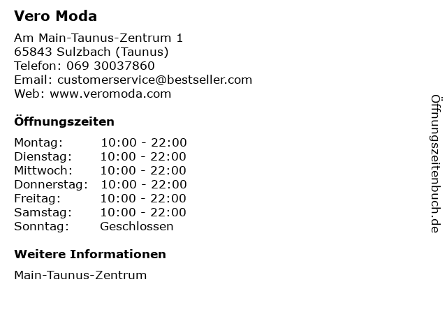 | Öffnungszeiten Vero Moda in Sulzbach (Taunus) anzeigen | |