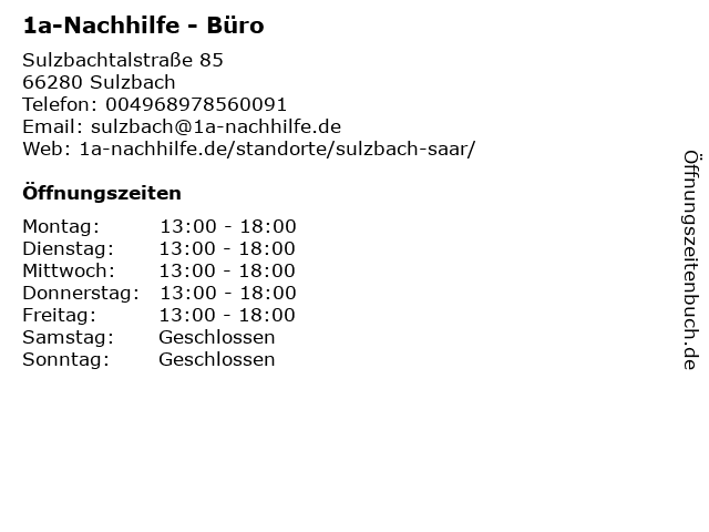 | Öffnungszeiten 1a-Nachhilfe - Büro in Sulzbach anzeigen | |
