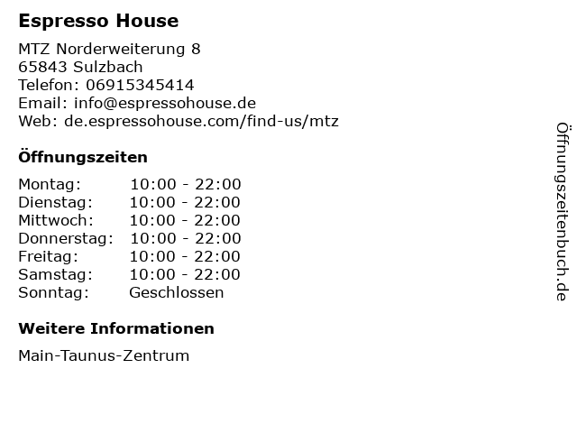| Öffnungszeiten Espresso House in Sulzbach anzeigen | |