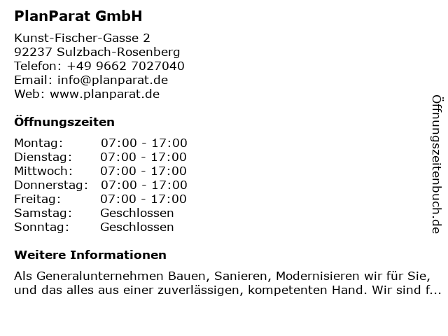 | Öffnungszeiten PlanParat GmbH in Sulzbach-Rosenberg anzeigen | |