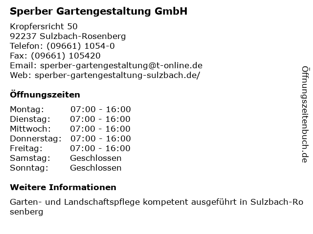 1 Sperber GmbH Gartengestaltung (Entfernung: 0,42 km) Kropfersrichter Str. 11, 92237 Sulzbach-Rosenberg 3 Brauerei-Gasthof & Flair-Hotel Sperber-Bräu (Entfernung: 3,22 km) Rosenberger Str. 14, 92237 Sulzbach-Rosenberg 6 Engelbert Sperber Bauunternehmen Gerüstbau u. -verleih (Entfernung: 8,99 km) Jakob-Oswald-Str. 11, 92289 Ursensollen |