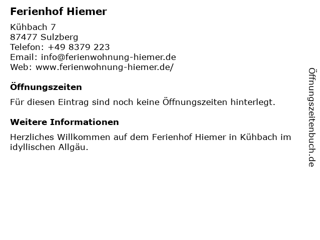 | Öffnungszeiten Ferienhof Hiemer in Sulzberg anzeigen | |