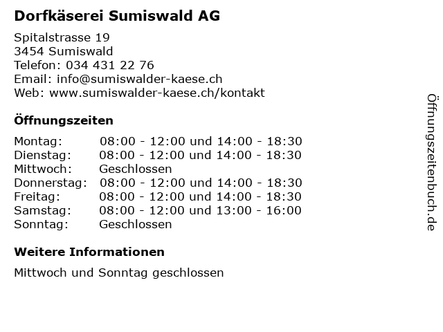 | Öffnungszeiten Dorfkäserei Sumiswald AG in Sumiswald anzeigen | |
