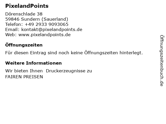 | Öffnungszeiten PixelandPoints in Sundern (Sauerland) anzeigen | |