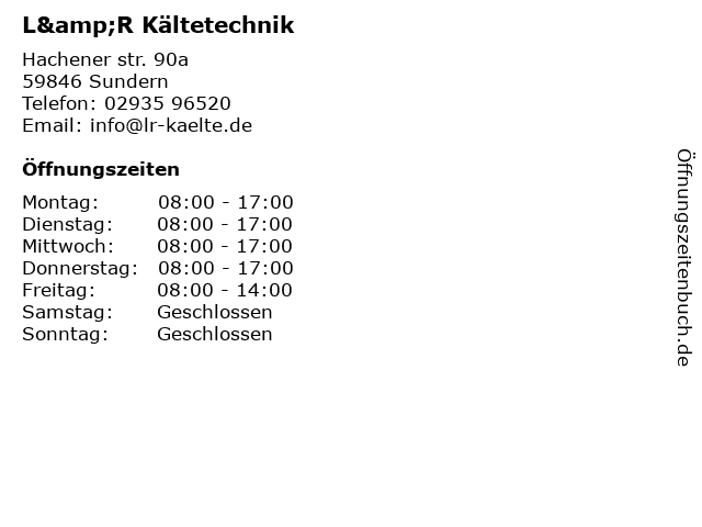 | Öffnungszeiten L&R Kältetechnik in Sundern anzeigen | |