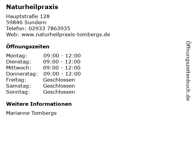 | Öffnungszeiten Naturheilpraxis in Sundern anzeigen | |
