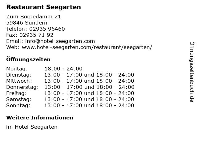 | Öffnungszeiten Restaurant Seegarten in Sundern anzeigen | |