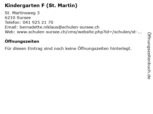 | Öffnungszeiten Kindergarten F (St. Martin) in Sursee anzeigen | |