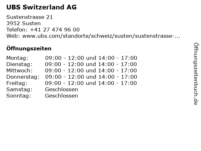 | Öffnungszeiten UBS Switzerland AG in Susten anzeigen | |