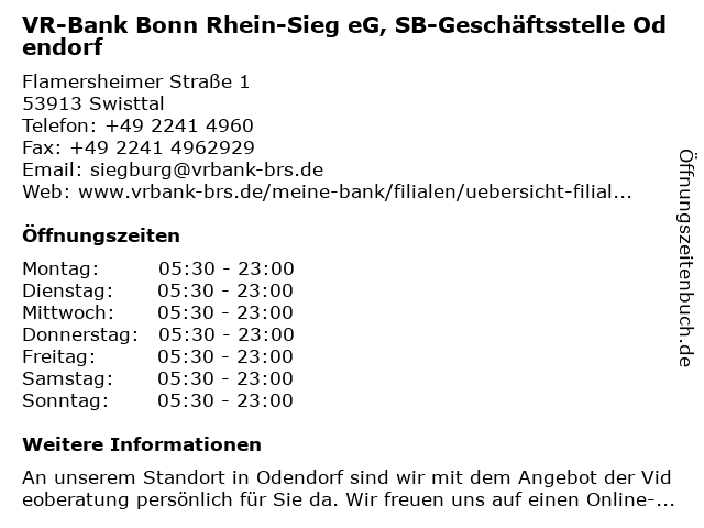 Branchen & Suchbegriffe zu VR-Bank Bonn Rhein-Sieg eG, SB-Geschäftsstelle Odendorf:bank, bausparen, beratung, eg, festgeld, geldautomat, genossenschaft, geschäftsstelle, immobilien, kredit, odendorf, rhein, sb, sieg, tagesgeld, versicherung, vr |