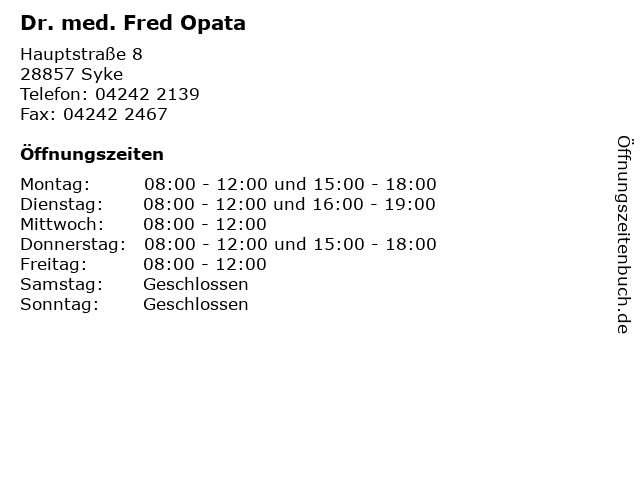 | Öffnungszeiten Dr. med. Fred Opata in Syke anzeigen | |