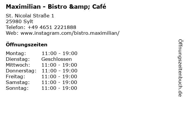 | Öffnungszeiten Maximilian - Bistro & Café in Sylt anzeigen | |