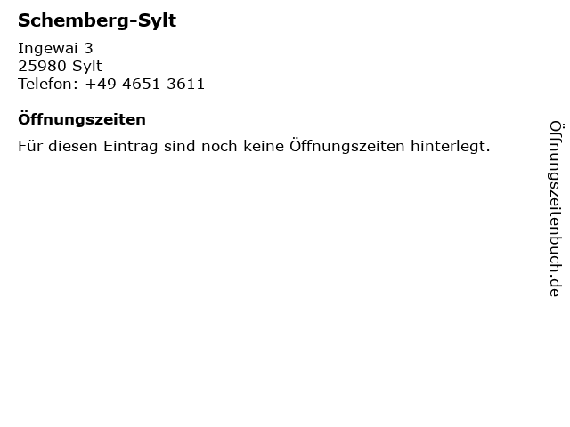 | Öffnungszeiten Schemberg-Sylt in Sylt anzeigen | |